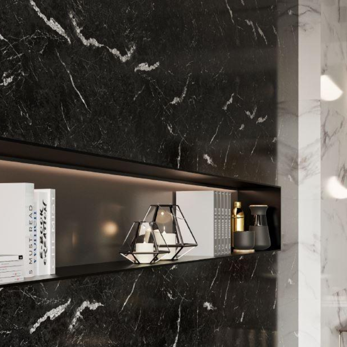 Azulejo porcelánico rectificado de forma rectangular e imitación a mármol. Descubre el encanto atemporal del pavimento cerámico. Estos azulejos con acabado brillo aportan un toque de elegancia a tu espacio.