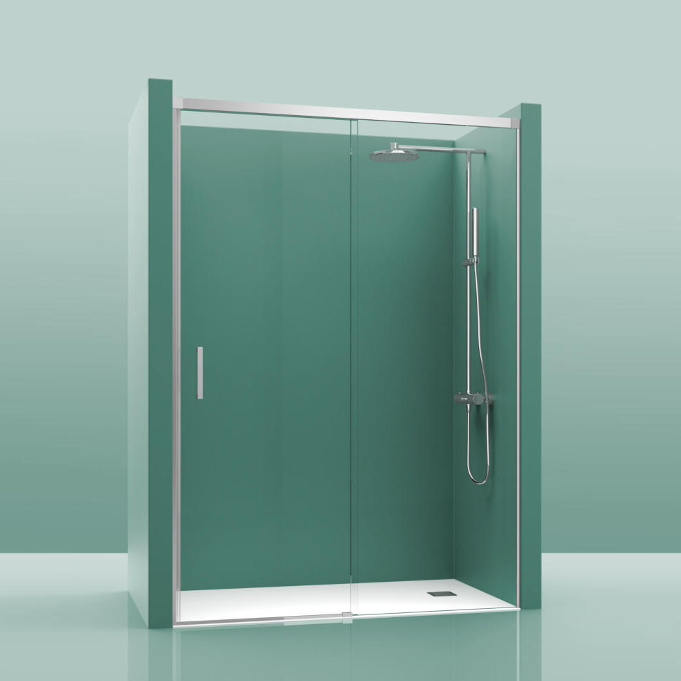 Mampara De Ducha Frontal 1 Cristal Fijo + 1 Cristal Puerta. Cosmos 100. Con una altura de 195cm y sistema de apertura de puertas correderas con rodamiento superior y cierre magnético. Perfilería en aluminio con vidrio templado de 6mm de espesor y una compensación de cruce de cristales de 5cm. Con tratamiento antical y puerta reversible. Consultar los listados de rango de instalación y apertura de la puerta de la mampara para saber que medida elegir. Este tipo de mampara es utilizada en los casos en los que el espacio de la ducha se encuentra entre tres paredes. Para tomar las medidas de la mampara, necesitas de tres medidas principales a lo ancho de lo que será la mampara, de pared a pared. La primera debes tomarla, aproximadamente, a unos 190 cm de altura, la segunda en la mitad y la tercera en la parte baja, a nivel de plato. Se tomará la menor como base con un margen de 0,5 cm y 1 cm menos.